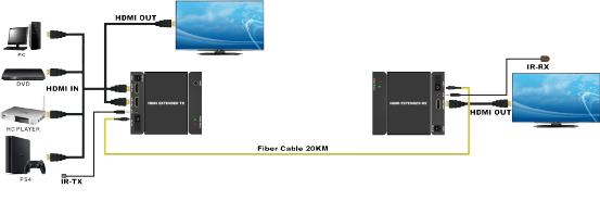 The HDMI Extender over single fiber is a tool for extending your HDMI signal over long distances to a compatible display. Instead of using expensive HDMI cables, your existing fiber cables/sockets can be utilized to perform advanced functions like transferring Deep Color (12 bits/color) video and digital audio, with a bandwidth up to 340MHz. The HDMI Transmitter and Receiver, over one fiber extender is your substantial HDMI extender tool. The HDMI Extender also support IR re-transmitting, so you can control the Source which is 200 meters outside using the HDMI extender.